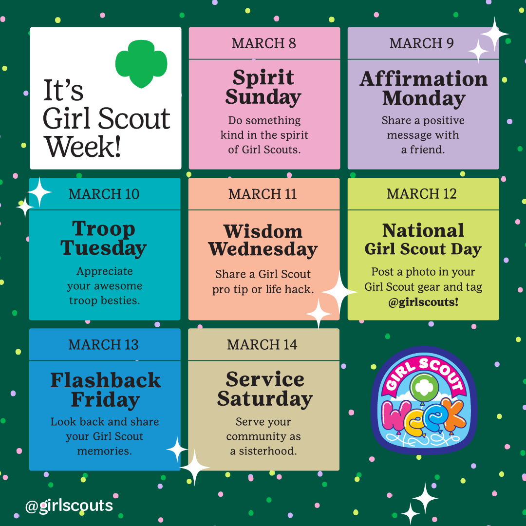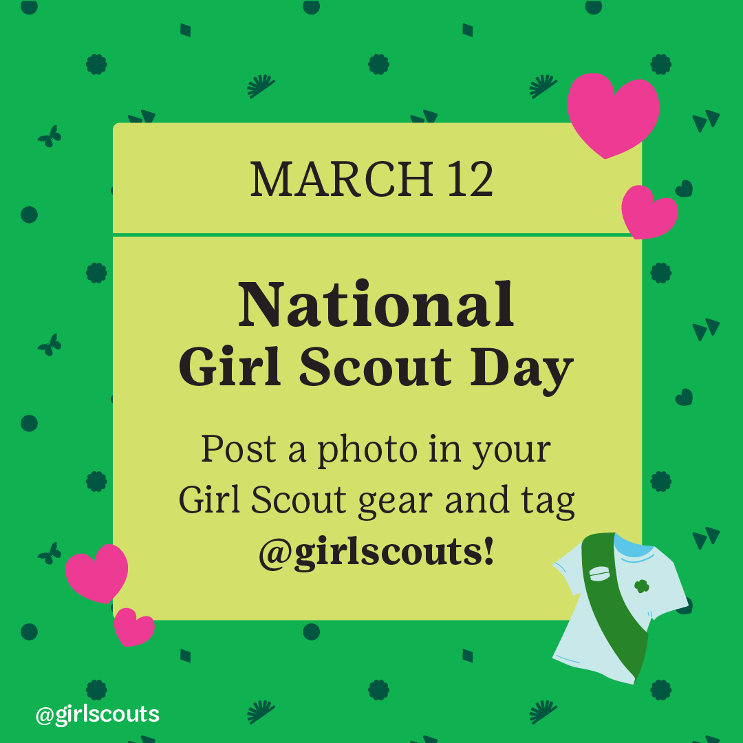 Girl Scouts' birthday commemorates the day in 1912 when Juliette Gordon Low officially registered the organization's first 18 members in Savannah, Georgia. Girl Scout Week will be observed from March 8–14, 2026. Join us each day in celebrating our worldwide sisterhood.
